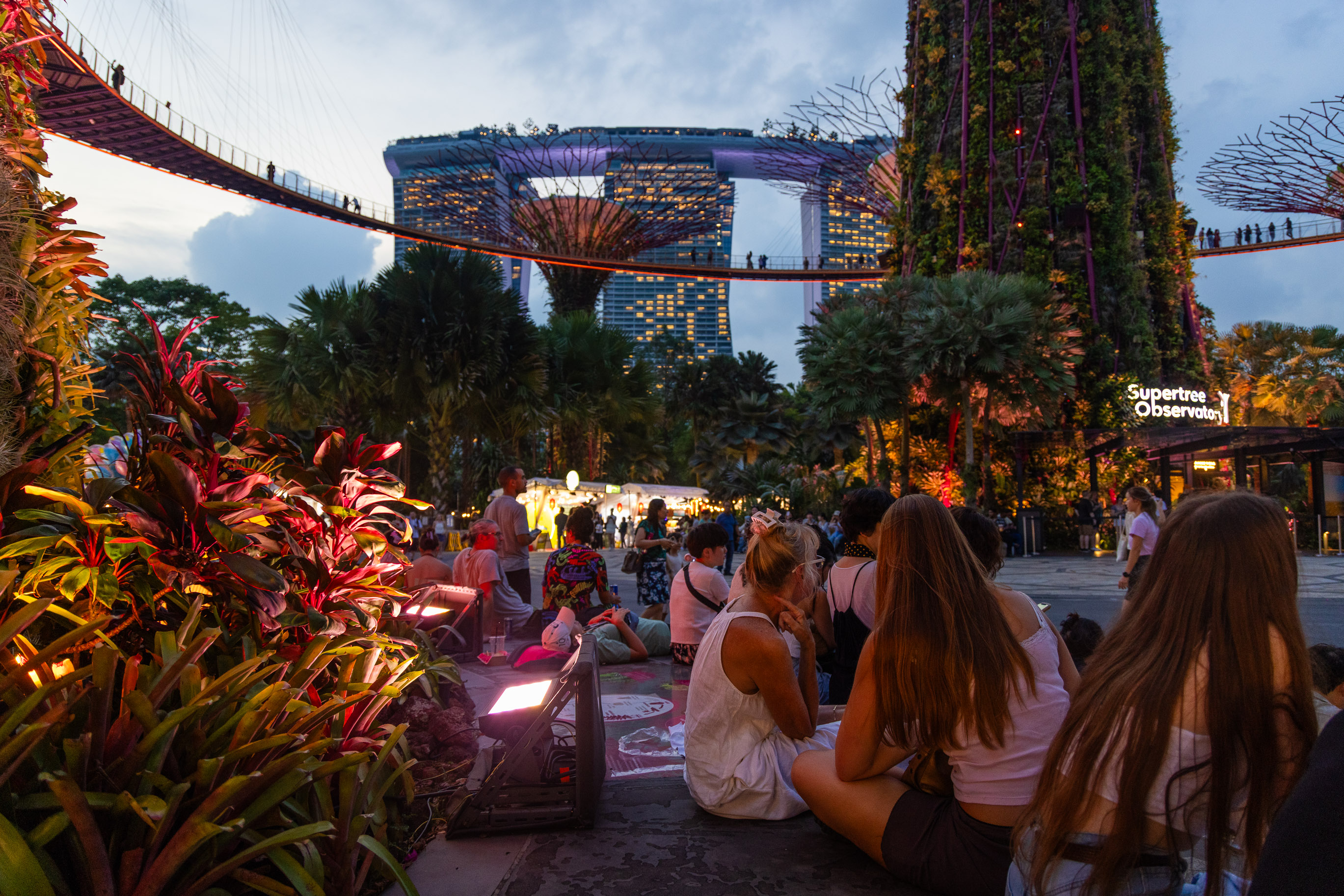 This photo was taken at Gardens by the Bay at 7 p.m. My wife and I had just finished dinner and were waiting for the light show that would start in 45 minutes. I was really enjoying the atmosphere at the time. The sky was gradually darkening, and people were starting to gather.